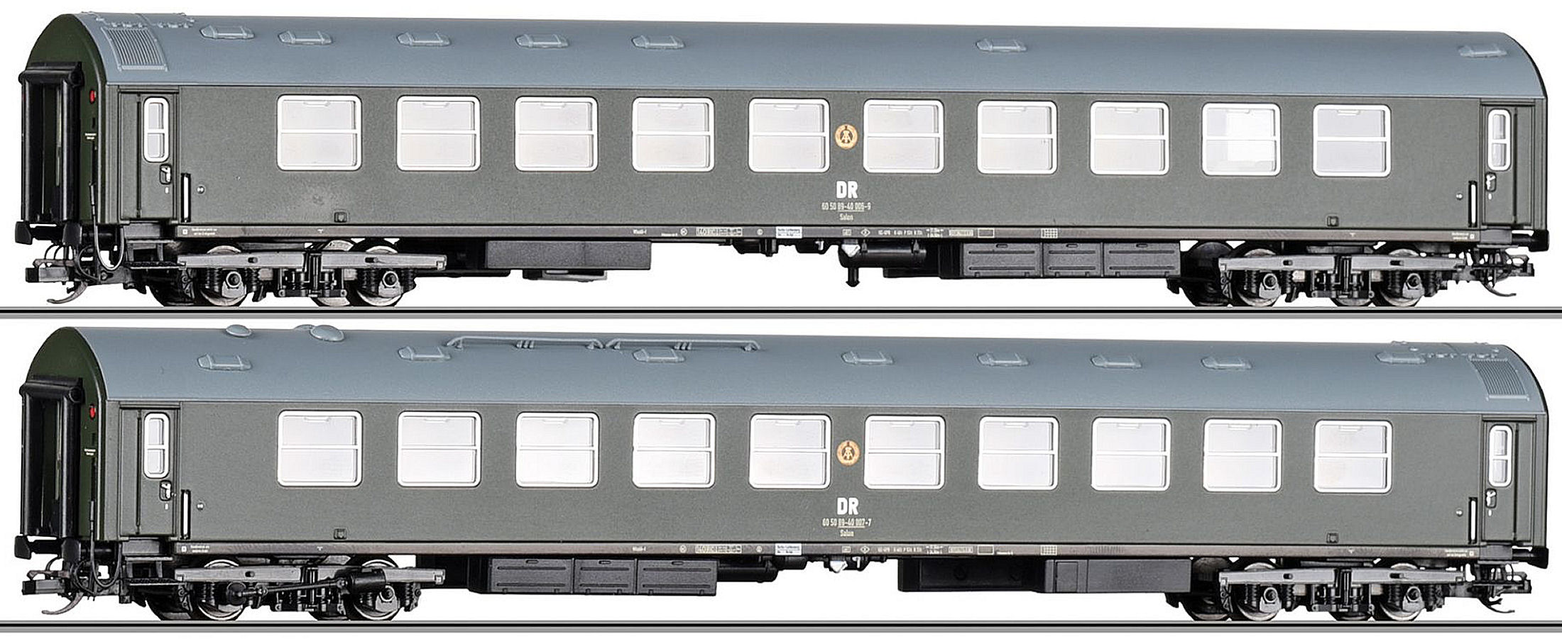 Set „Salonwagen der DDR-Regierung Baujahr 1966” bestehend aus zwei Reisezugwagen typ Y der Deutsche Reichsbahn. Länge über Puffer 410 mm. |