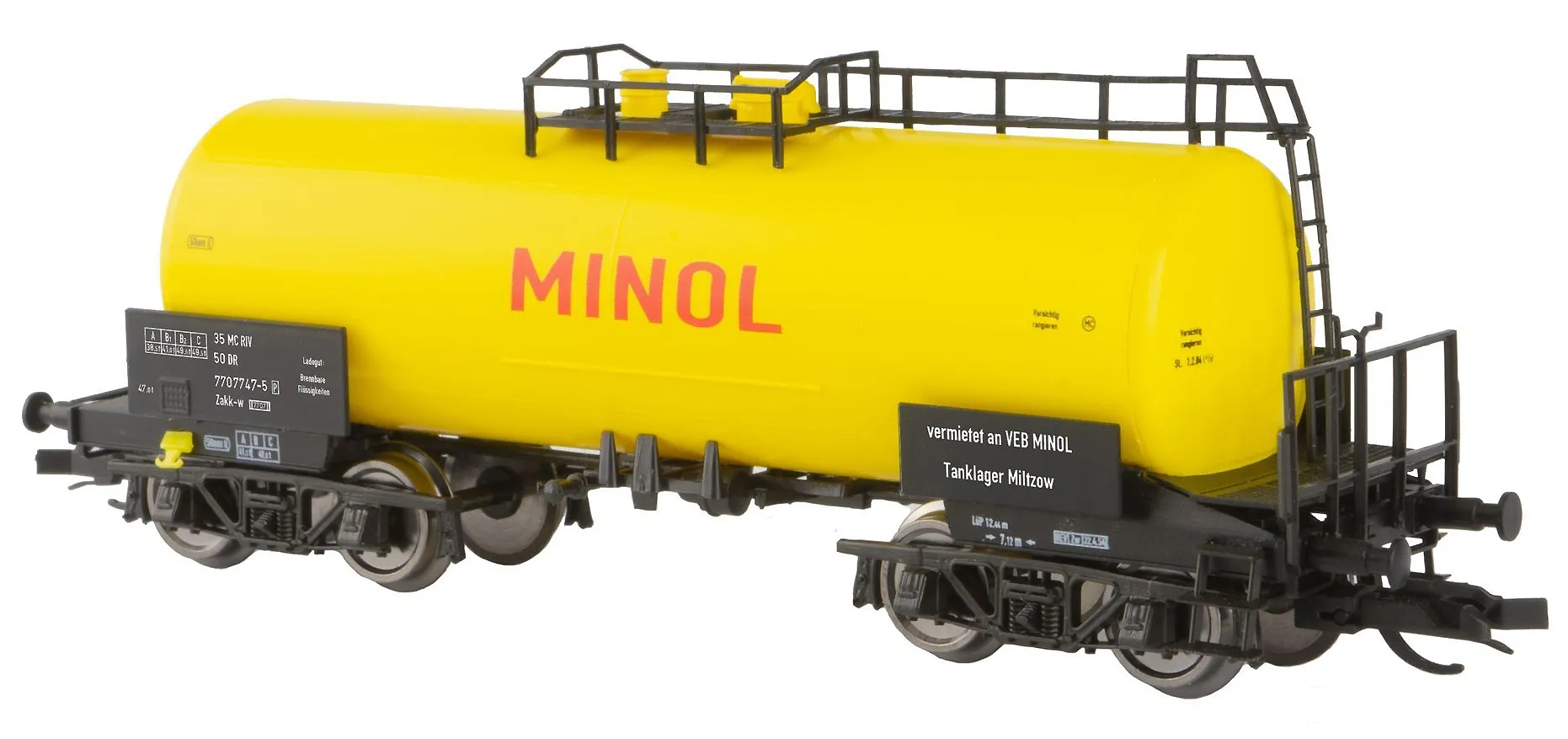 4-achsiger Kesselwagen Zakk-w 7707 Betriebsnummer 35 50 7707747-5 der Deutsche Reichsbahn „MINOL”. Länge über Puffer 104 mm. |