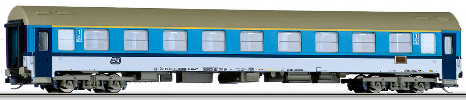 Wagon osobowy Aee 140 1 klasy (typ Y) o numerze CZ-ČD 61 54 19-70 008-8 kolei Czeskie Koleje Państwowe (ČD) z przesuwnymi drzwiami, w malowaniu „Najbrt”. Długość 204 mm. |