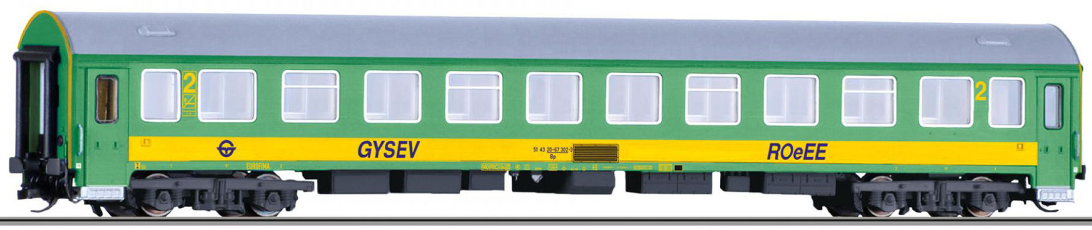 Reisezugwagen Bp 2. Klasse (Typ Y/B 70) Betriebsnummer 51 43 20-67 302-3 der Győr-Sopron-Ebenfurt-Bahn (GySEV) mit Schwenkschiebetüren. Länge über Puffer 204 mm. |