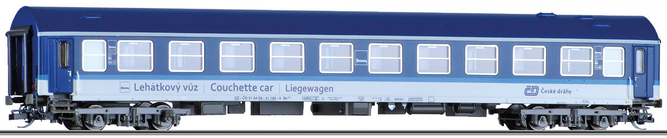 Liegewagen Bc 833 (Type Y/B 70) 2. Klasse Betriebsnummer CZ-ČD 51 54 59-41 165-5 der Tschechische Bahnen (ČD) im Farbschema „Najbrt II”. Länge über Puffer 204 mm. |