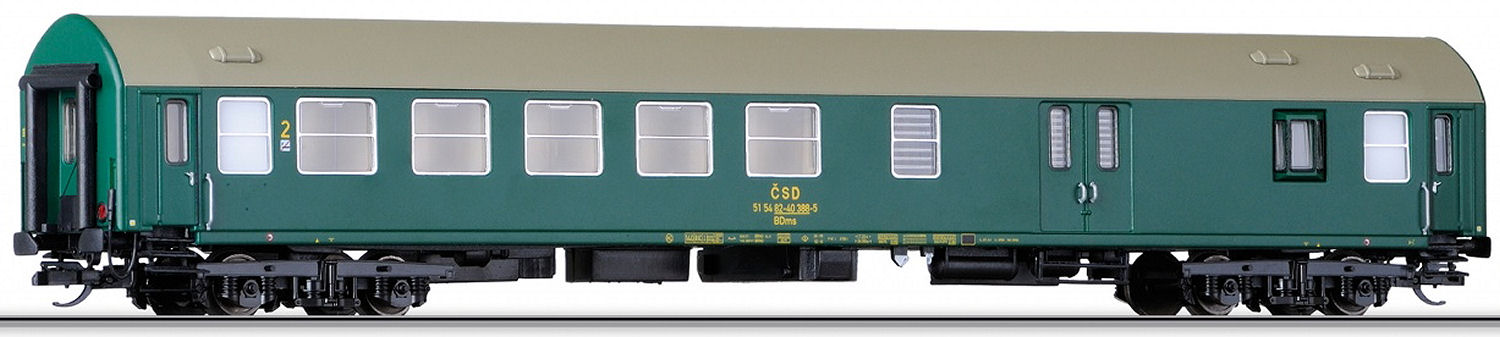 en   Passenger coach BDms.   Passenger coach BDms (type Y/B 70) 2nd class with baggage compartement operating number 51 54 82-40 388-5 of the Czechoslovak State Railways (ČSD). Length from buffer to buffer 204 mm.