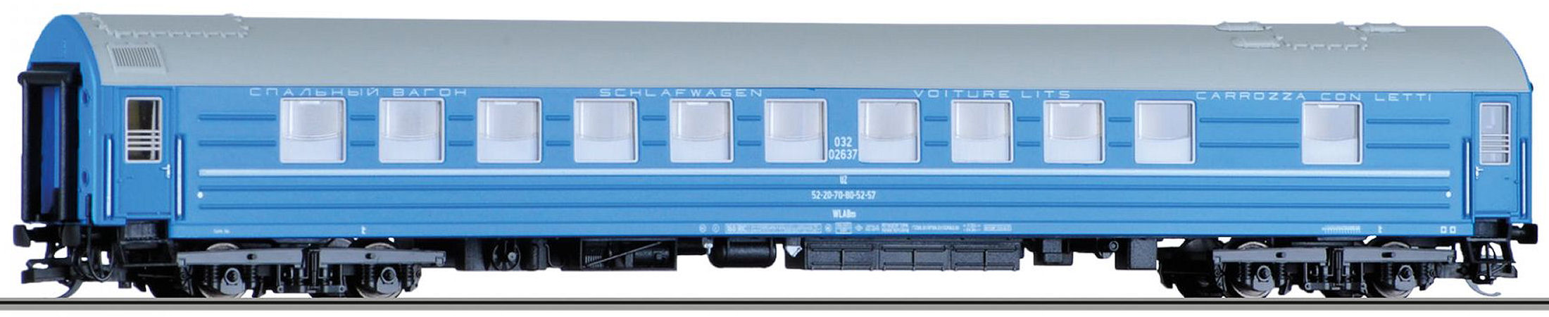 en   Sleeping car WLABm.   Sleeping car WLABm (type Y) operating number 52-20-70-80-52-57 of the Ukrainian Railways (УЗ/UZ). Length from buffer to buffer 204 mm.
