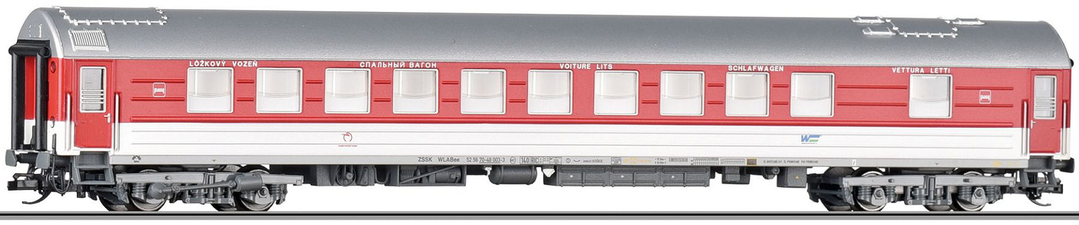 Long-distance sleeping car WLABee (type Y) operating number ZSSK 52 56 70-48 003-3 of the Railway Company Slovakia (ŽSSK). Length from buffer to buffer 204 mm. |