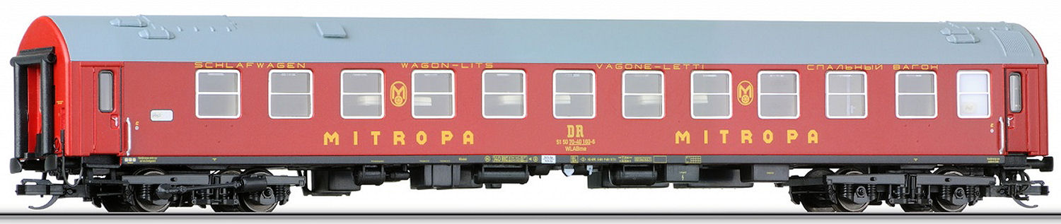 Sleeping car WLABme (type Y) operating number 51 50 70-40 160-6 of the Deutsche Reichsbahn „MITROPA”. Length from buffer to buffer 204 mm. |