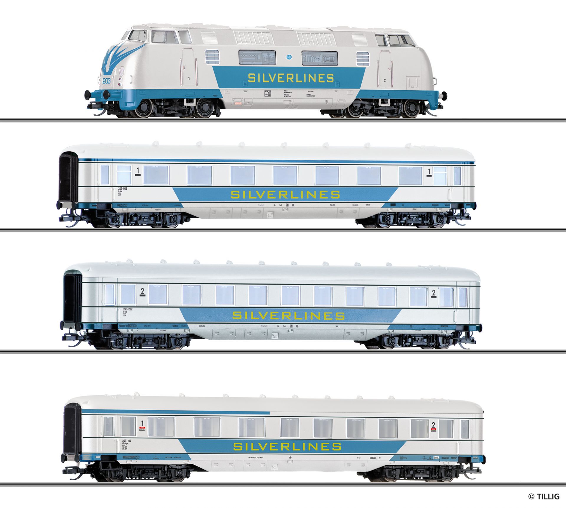 en   Set „SILVERLINES”.   Set „SILVERLINES”. Contents: diesel locomotive V200 203 and 3 passenger cars of the SILVERLINES. Length from buffer to buffer 689 mm.