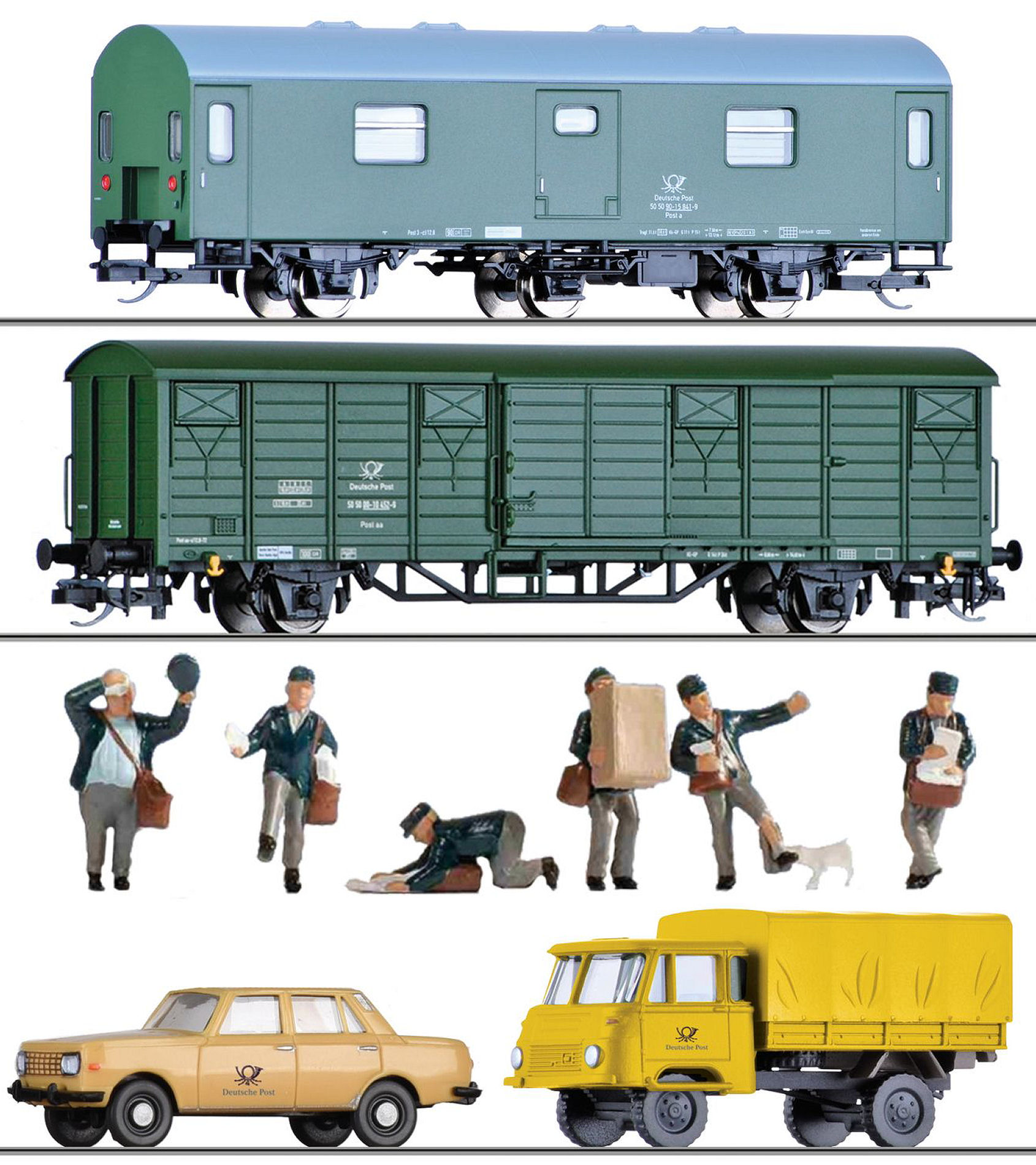 Set „Deutsche Post" bestehend aus einem gedeckten Güterwagen Gbs, einem Gepäckwagen, einem Wartburg, einem Robur und Figuren der Deutsche Post. |