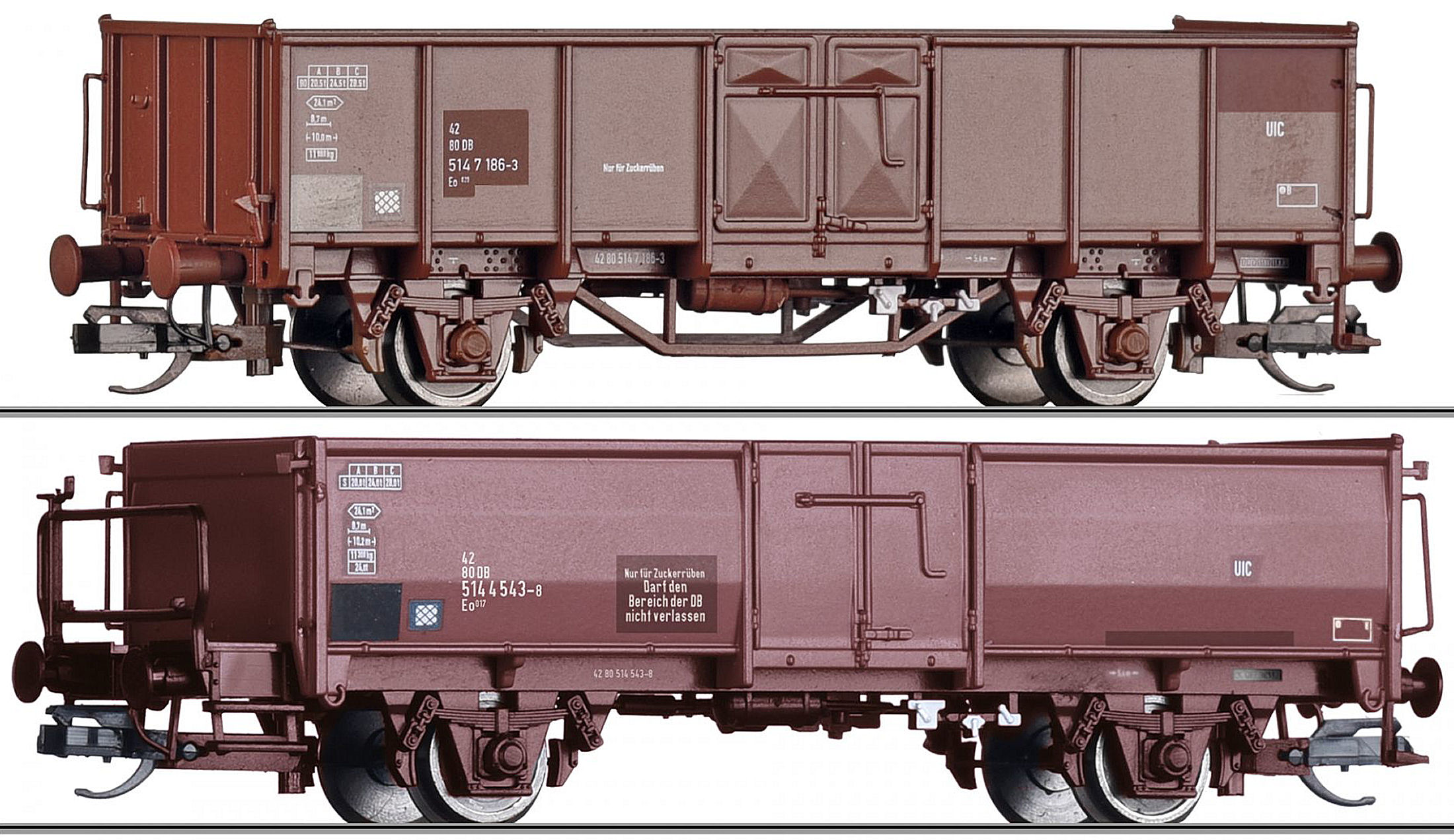 Güterwagenset bestehend aus zwei offenen Güterwagen Eo der Deutsche Bundesbahn, „Rübenzug Teil 2”. Länge über Puffer 170 mm. |
