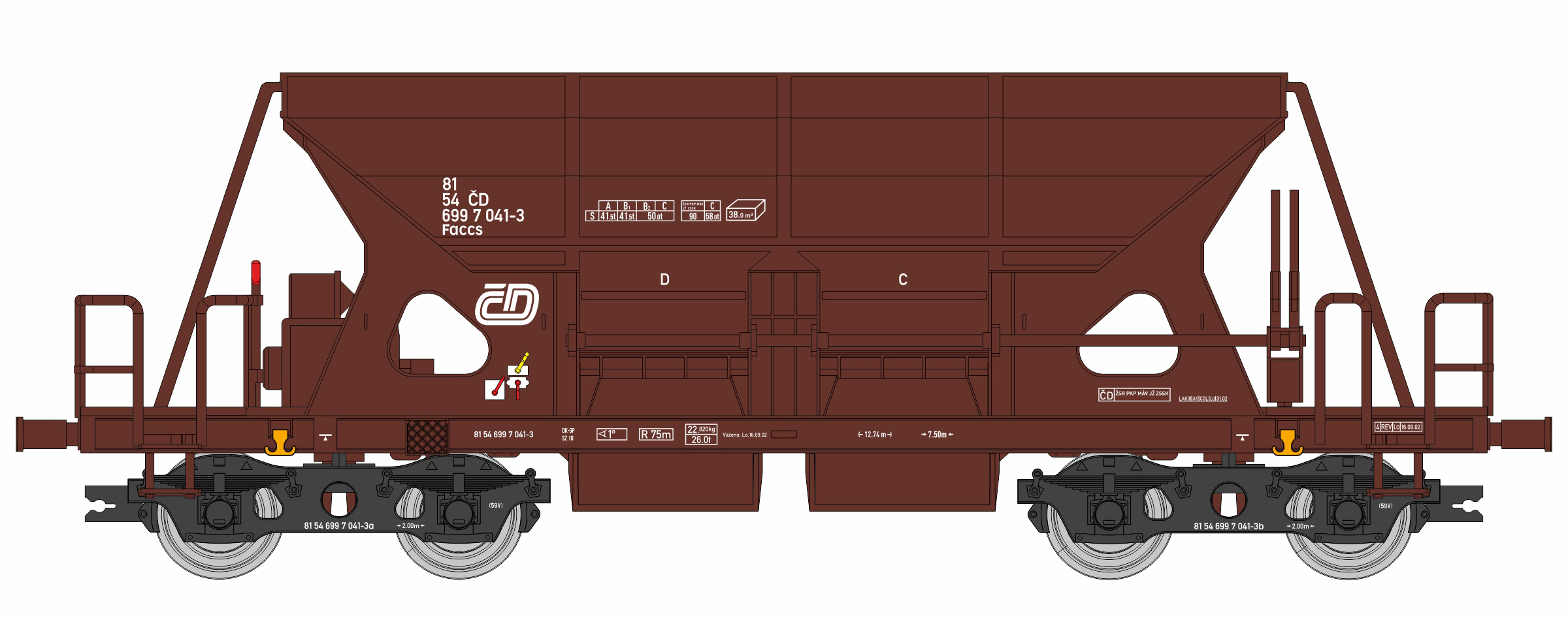en   4-axes hopper Faccs.   4-axes self-unloading hopper wagon Faccs (Sas) operating number 81 54 699 7 041-3 of the State Railroad of Czech (ČD). Length from buffer to buffer 108 mm.