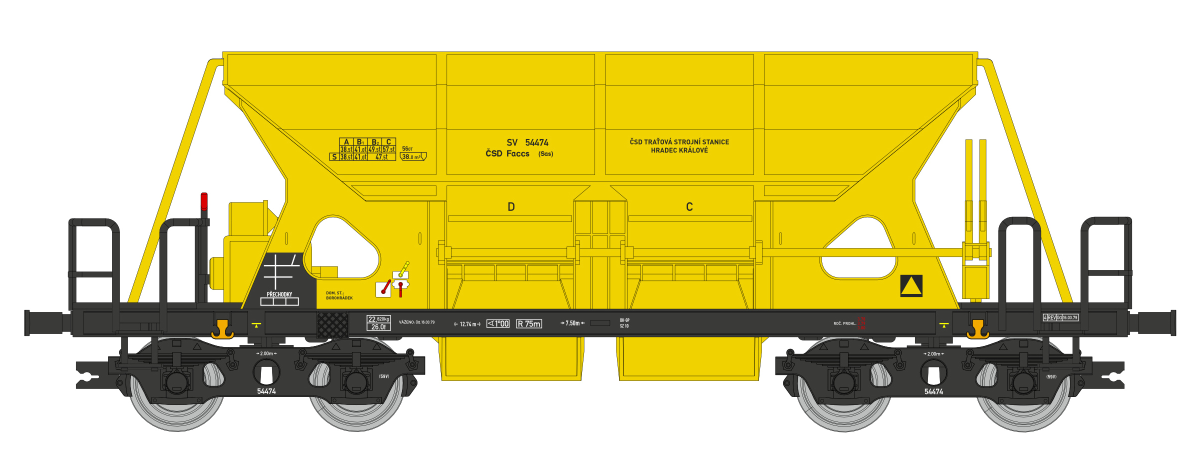 cz   Čtyřnápravový samovýsypný vůz ř. Faccs.   Čtyřnápravový samovýsypný vůz řady Faccs (Sas) SV 54474 Československé státní dráhy (ČSD) „TSS Hradec Králové”. Délka modelu 107 mm.