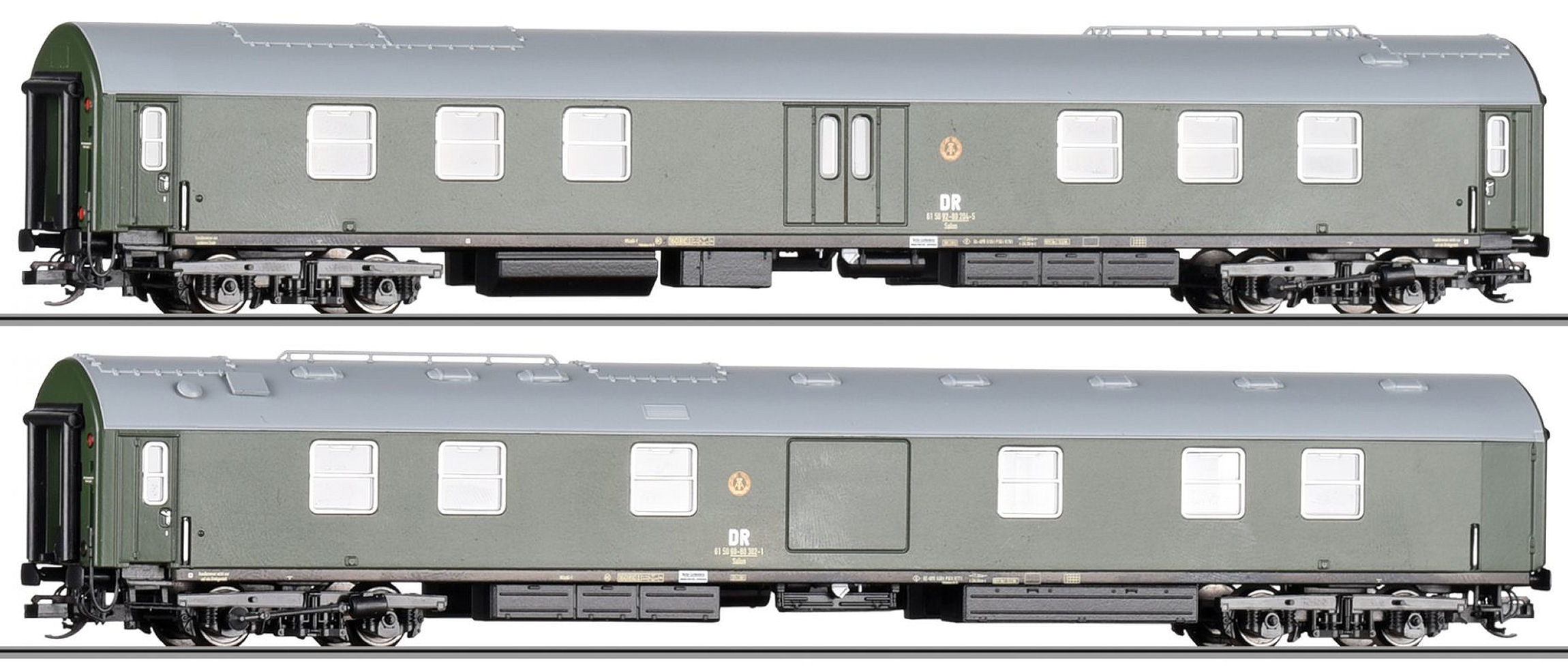 Reisezugwagenset „Salonwagenzug 5” bestehend aus einem Salonautotransportwagen und einem Maschinen-Gepäckwagen typ Y der Deutsche Reichsbahn. Länge über Puffer 410 mm. |