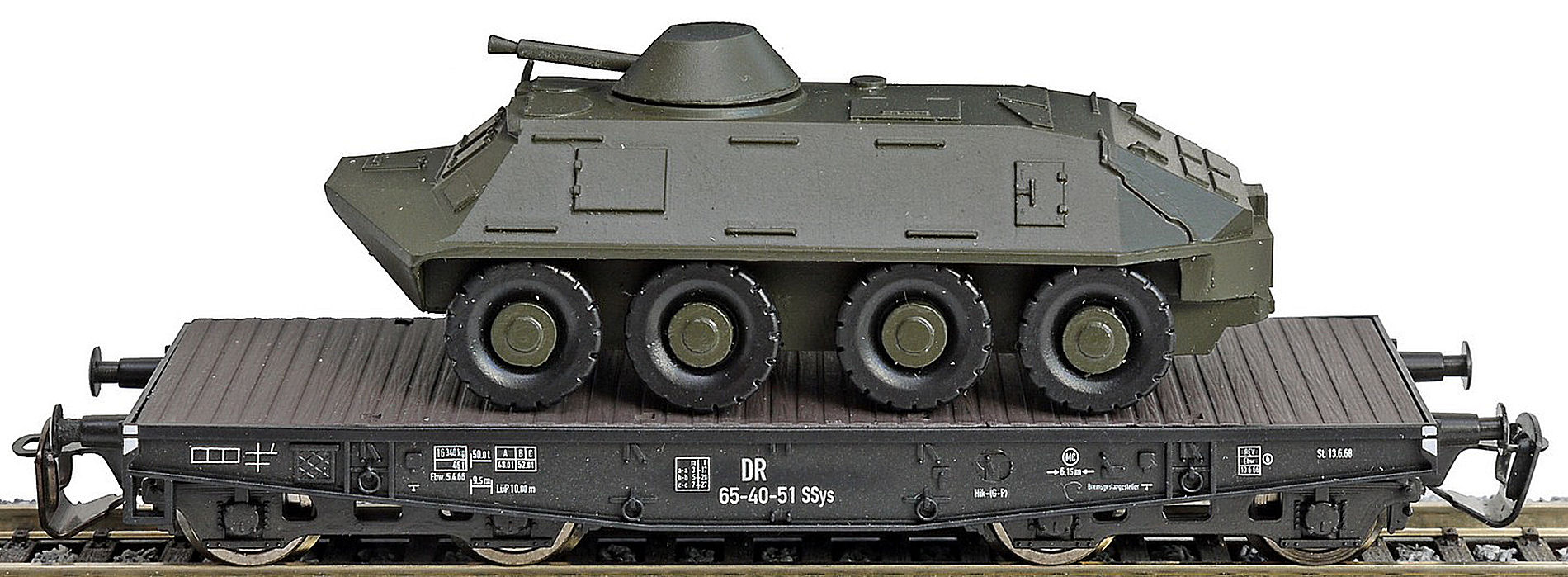 4-axles flat waggon with stakes SSys 65-40-51 of the Deutsche Reichsbahn with armored reconnaissance vehicle. Length from buffer to buffer 90 mm. |