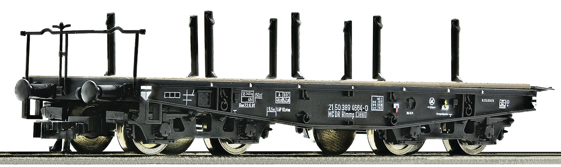 4-axles flat waggon with stakes Rlmpp 3890 operating number 21 50 389 4664-0 of the Deutsche Reichsbahn. Length from buffer to buffer 90 mm. |