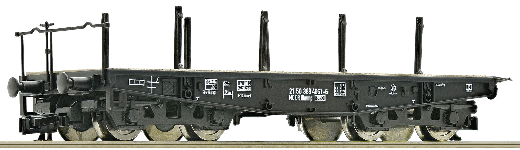 4-axles flat waggon with stakes Rlmpp 3890 operating number 21 50 389 4661-6 of the Deutsche Reichsbahn. Length from buffer to buffer 90 mm. |