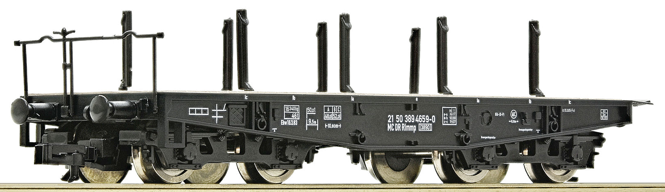 4-axles flat waggon with stakes Rlmpp 3890 operating number 21 50 389 4659-0 of the Deutsche Reichsbahn. Length from buffer to buffer 90 mm. |