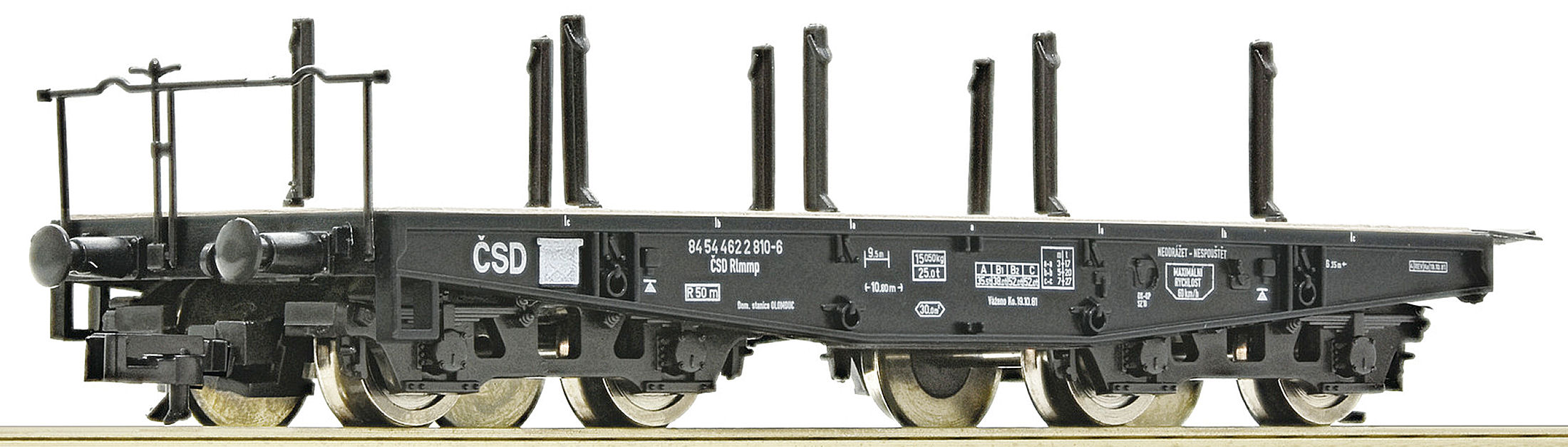 4-axles flat waggon with stakes Rlmpp 3890 operating number 84 54 462 2 810-6 of the Czechoslovak State Railways (ČSD). Length from buffer to buffer 90 mm. |