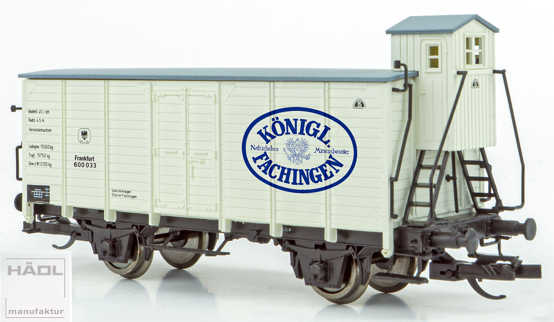 Heat-insulated wagon operating number Frankfurt 600 033 with elevated brakeman's cabin „Königlich Fachingen”. Length from buffer to buffer 81 mm. |