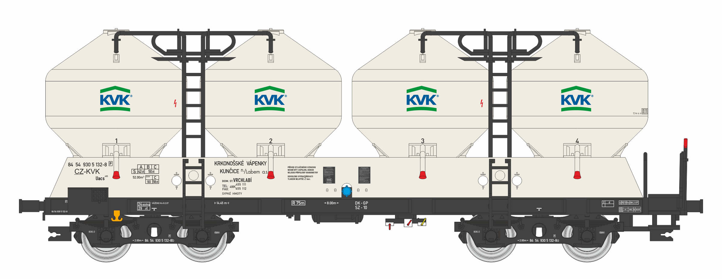 Čtyřnápravový vůz na cement a sypké hmoty rady Uacs 451.1 číslo 84 54 930 5 132-8 CZ-KVK Krkonošské Vápenky Kunčice, a.s. (ČD). Délka modelu 130 mm. |