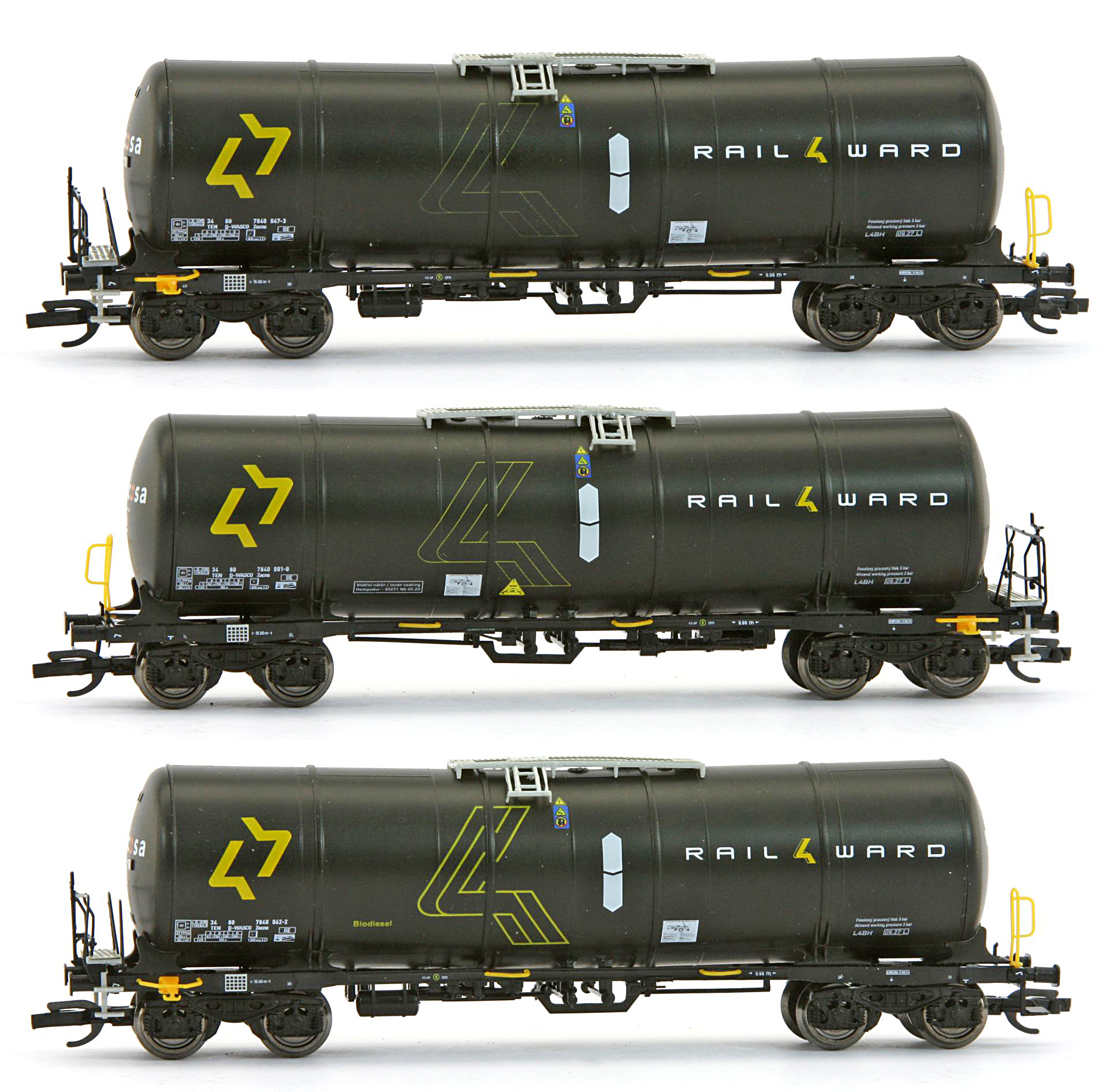 Zestaw 3 cystern Zacns 88 prywatnego przewoźnika WASCOSA AG, Luzern. Długość 274 mm. |