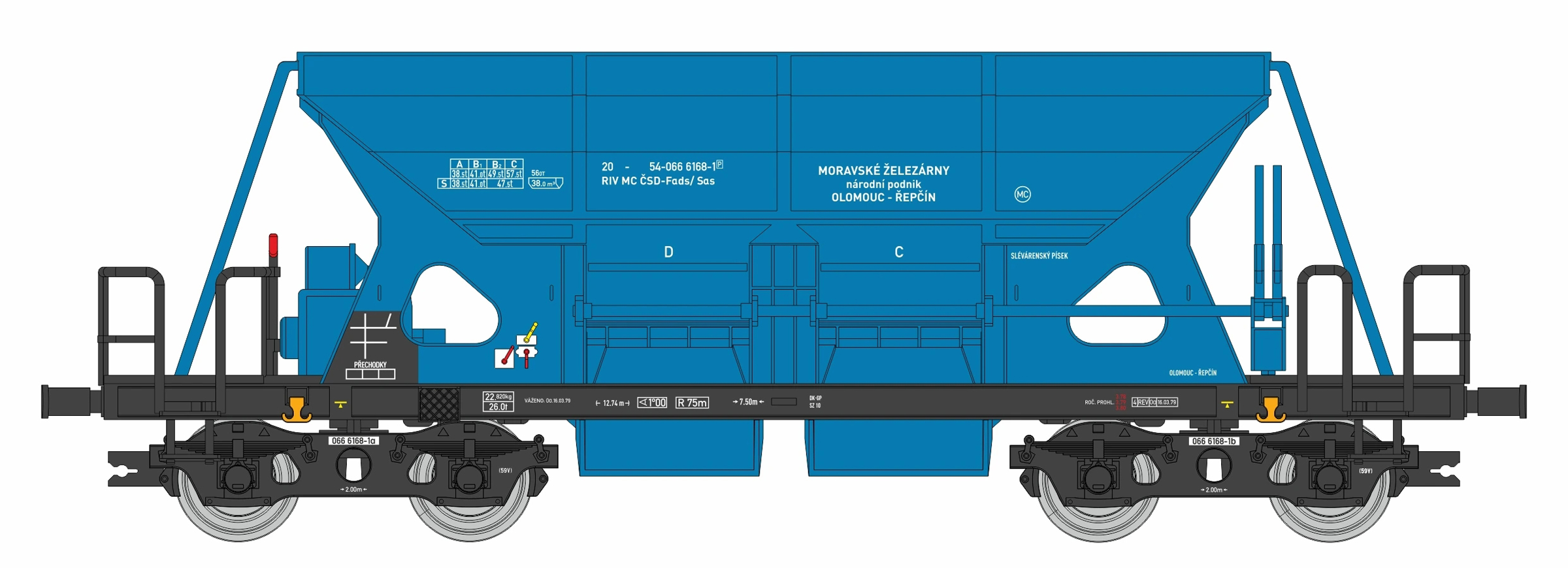 4 osiowy wagon samowyładowczy Fads/Sas o numerze 20-54-066 6168-1 kolei Czechosłowackie Koleje Państwowe (ČSD) „Moravské železárny”. Długość 108 mm. |
