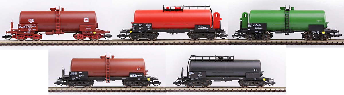 Zestaw 5 cystern MÁV/CFR/ČSD/2xPKP „Ost-Bahn-Set“. Długość 5 x 104 mm. |