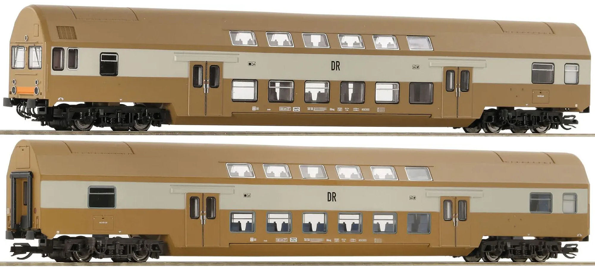 Soupravá 2 patrové vozy DBm železnice Státní dráhy NDR (DR). Délka modelu 446 mm. |