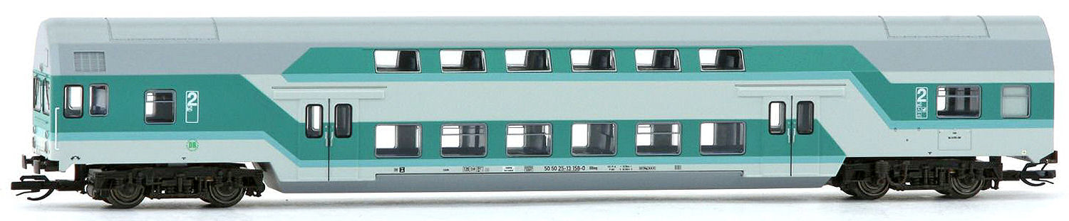 Double-deck driving-cab DBmq 2nd class, operating number 50 50 25-13 158-0 of the Deutsche Reichsbahn in mint green. Length from buffer to buffer 223 mm. |