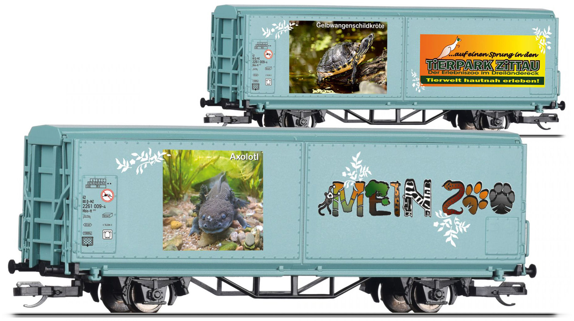 en   Start - Sliding wall box car Hbis-tt.   Sliding wall box car Hbis-tt293 car number 42 80 2261 009-4 D-MZ of the „Mein Zoo”. Length from buffer to buffer 117 mm.