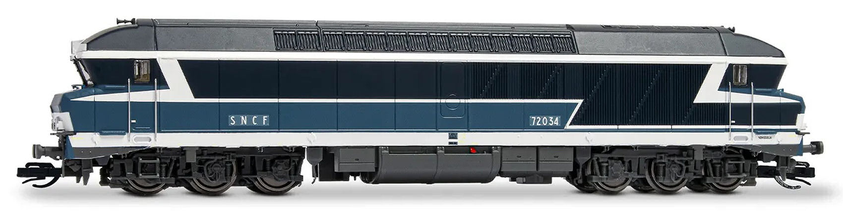6-osiowa lokomotywa spalinowa CC 72034, oryginalne malowanie Francuskich Kolei Państwowych (SNCF). Długość 168 mm. |