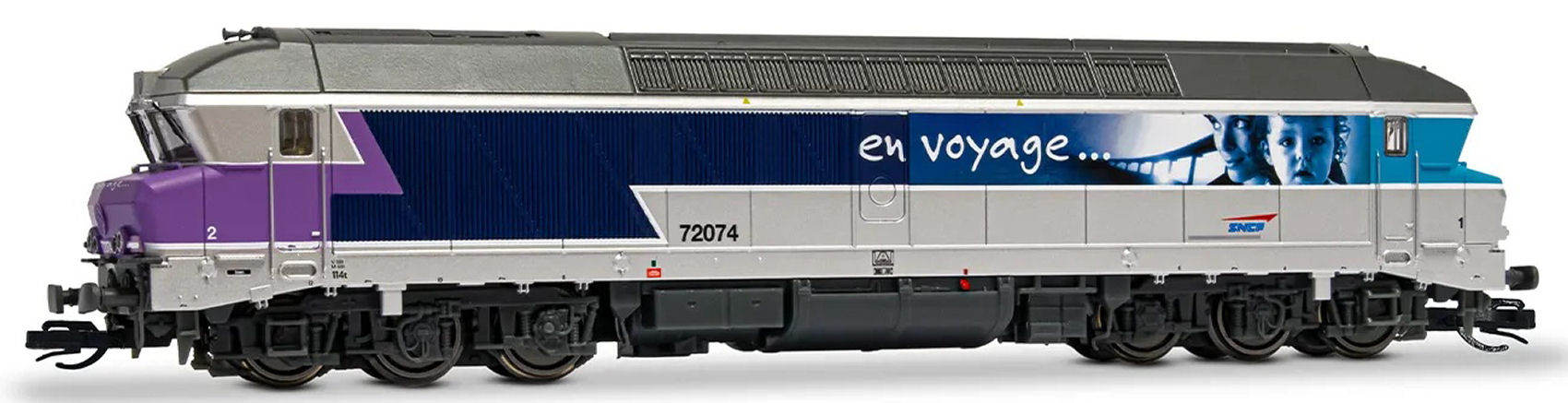 6-nápravová dieselová lokomotiva CC 72074, železnice Národní společnost francouzských drah (SNCF) „En voyage”. Délka modelu 168 mm. |