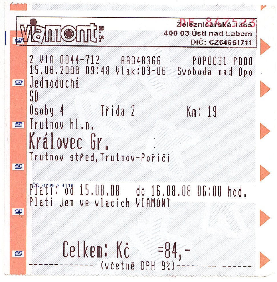 Czeski konduktor ma w ręku taki komputerek, który po podaniu ilości osób i trasy w ok 10 sekund wypluwa bilet (skan po prawo), natomiast