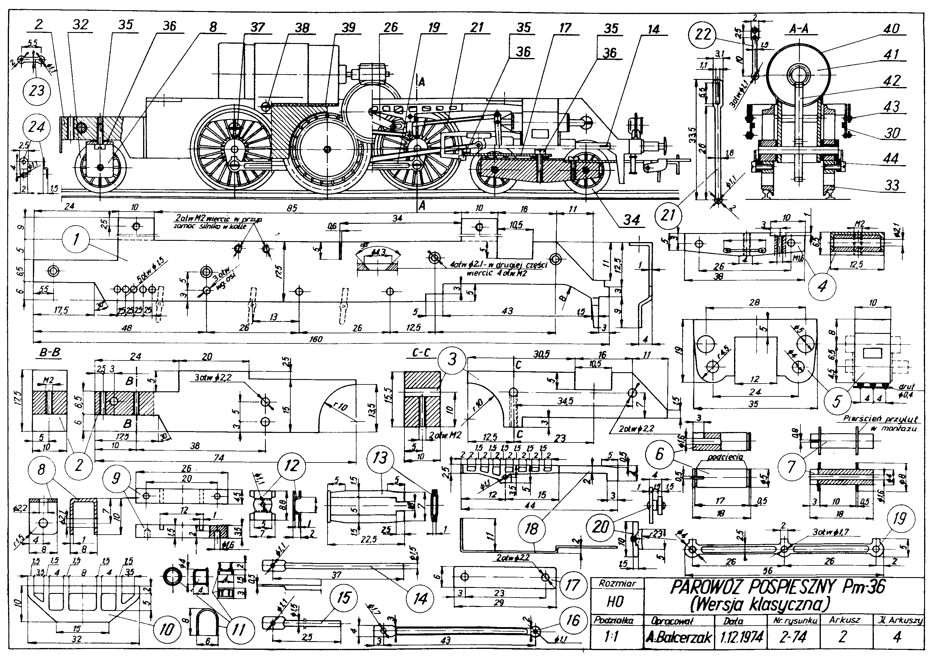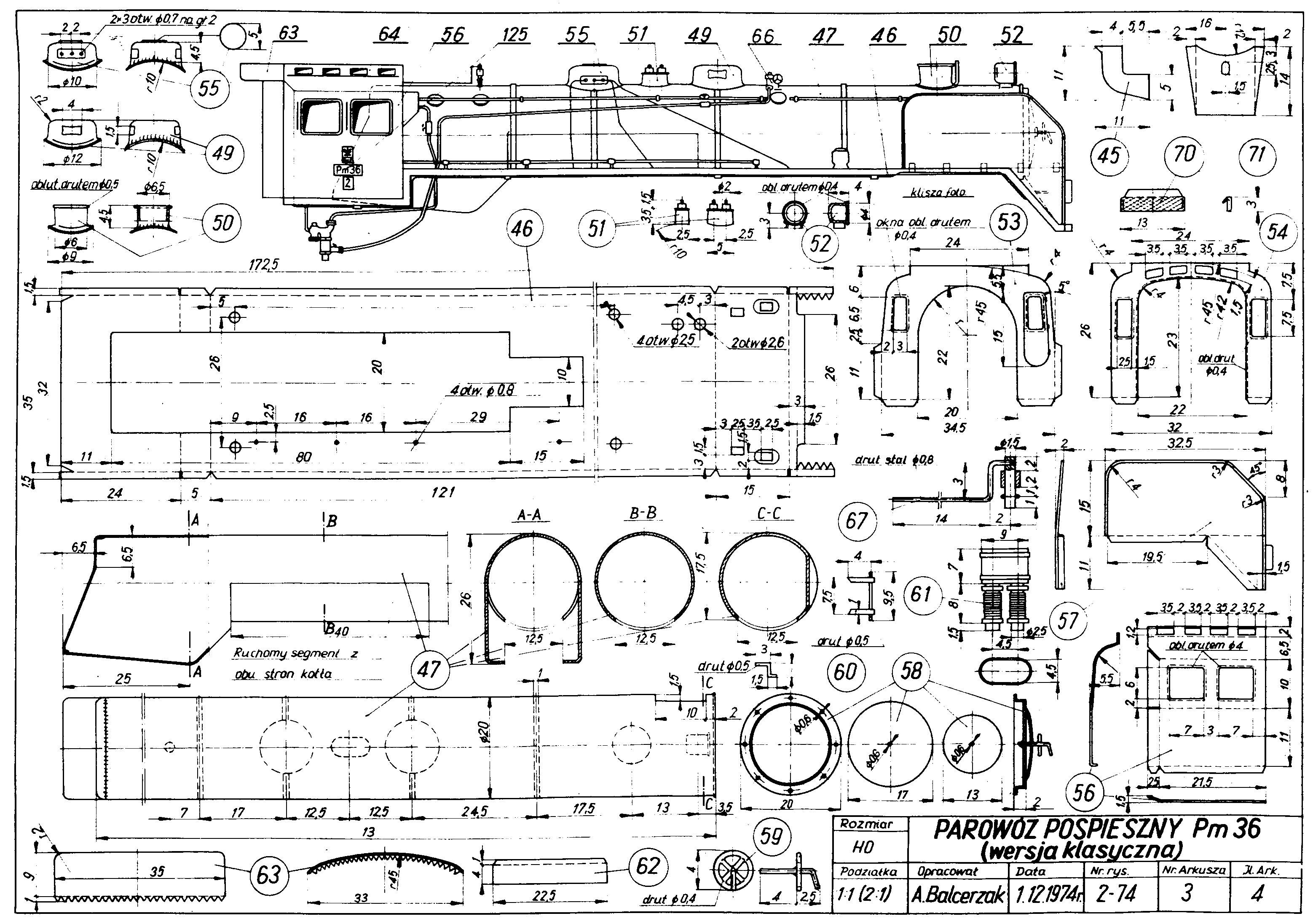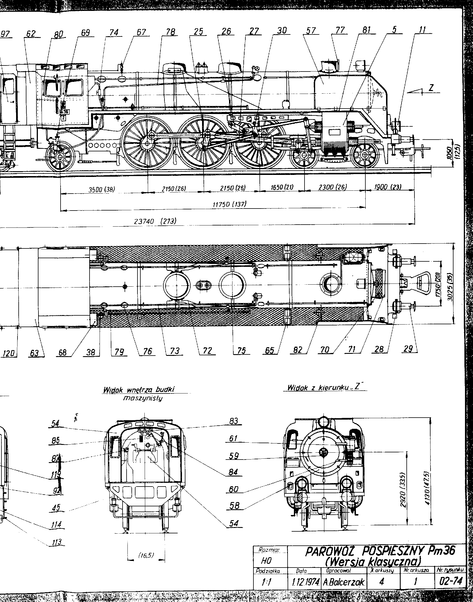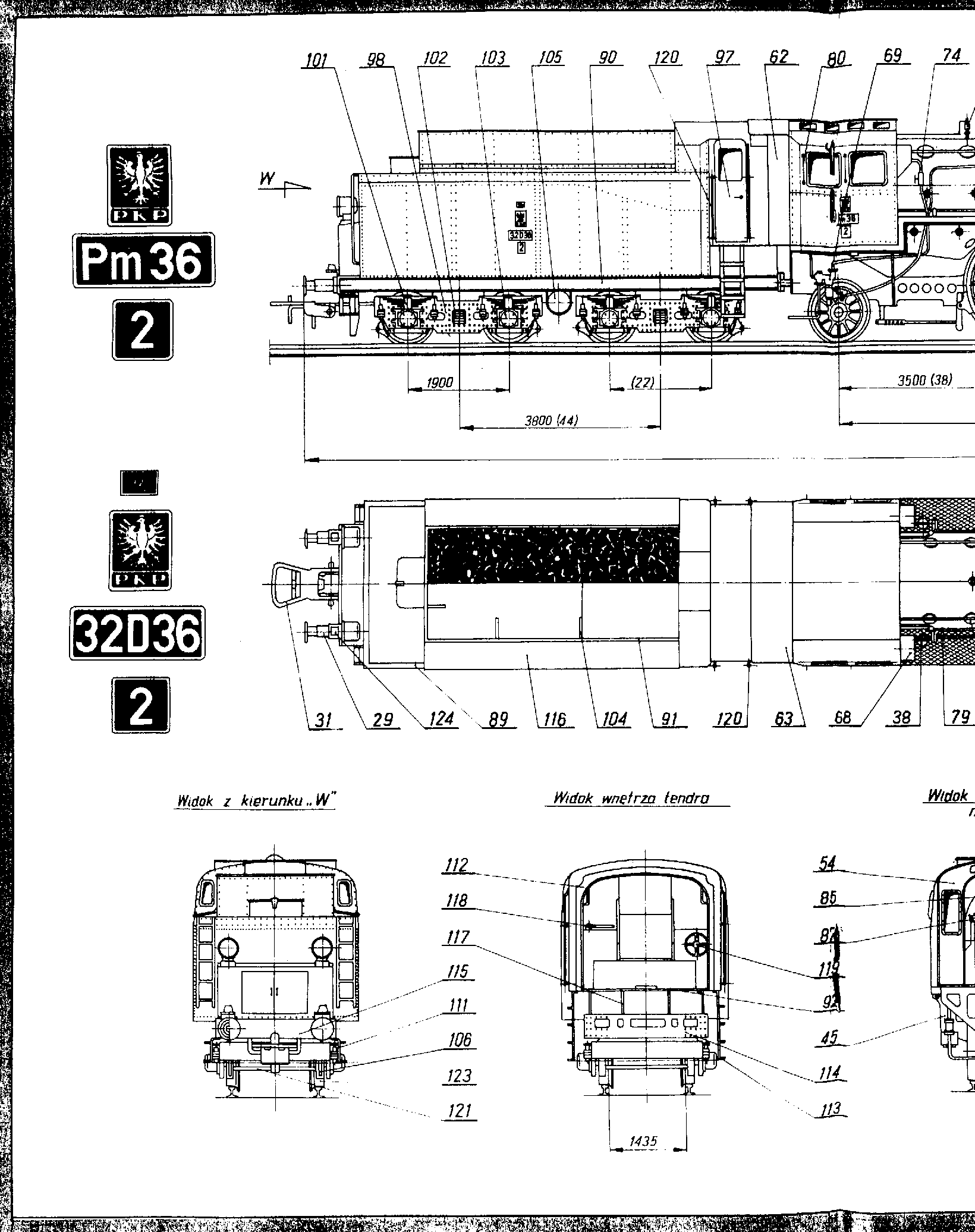 Arkusz 1 przedstawia parowóz Pm-36 w kilku rzutach i przekrojach